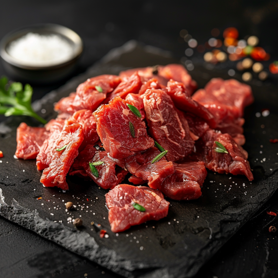 Rindsgeschnetzeltes ist ein vielseitiges und zartes Gericht, das aus feinen Fleischstreifen besteht. Ideal für schnelle Pfannengerichte, überzeugt es mit seinem reichen Geschmack und saftiger Konsistenz. Perfekt für unkomplizierte und köstliche Mahlzeiten.